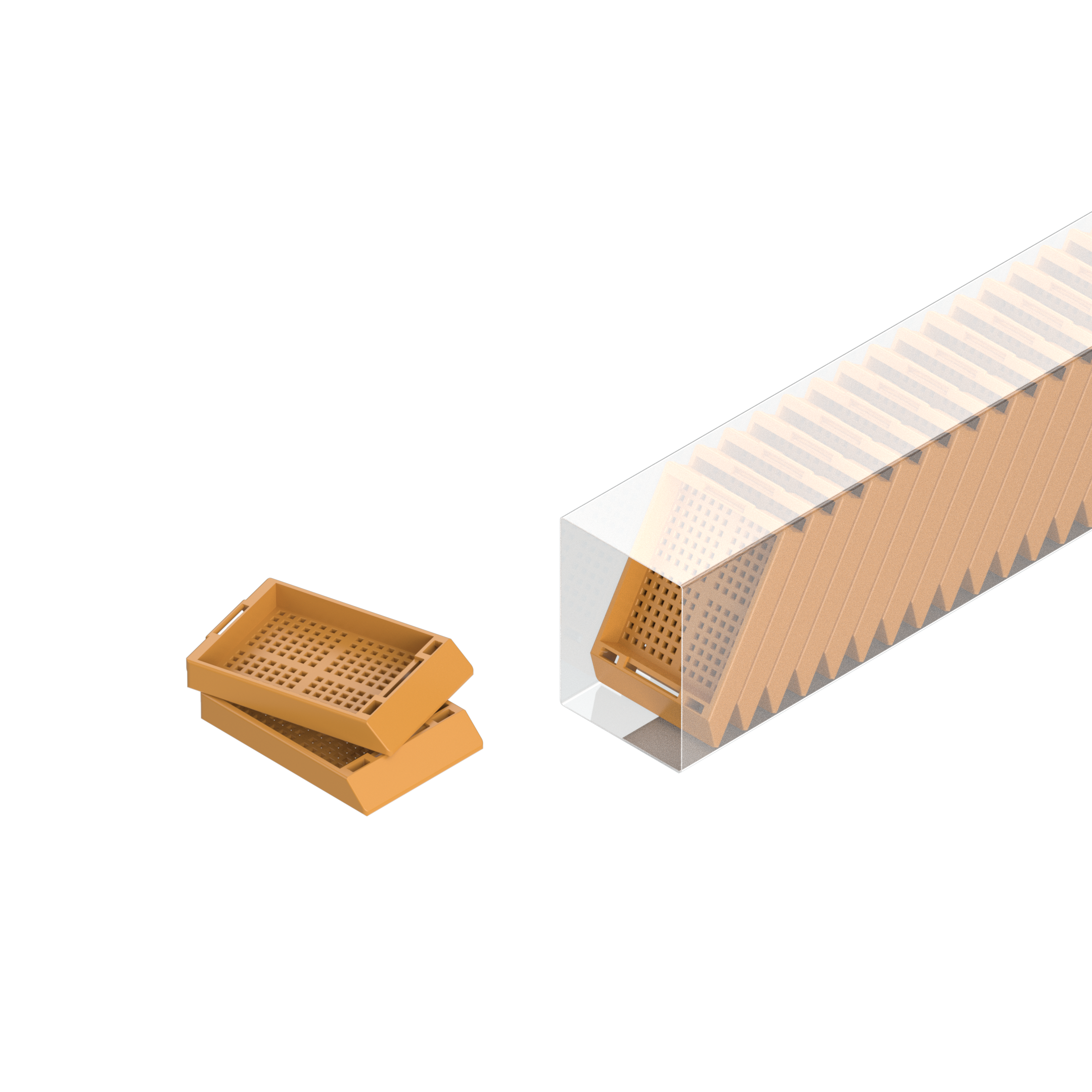 Die Einbettkassetten sind für die Verwendung mit Kassettendruckern gebrauchsfertig im Magazin vorgestapelt. Ein Magazin enthält 75 Einbettkassetten ohne Deckel.