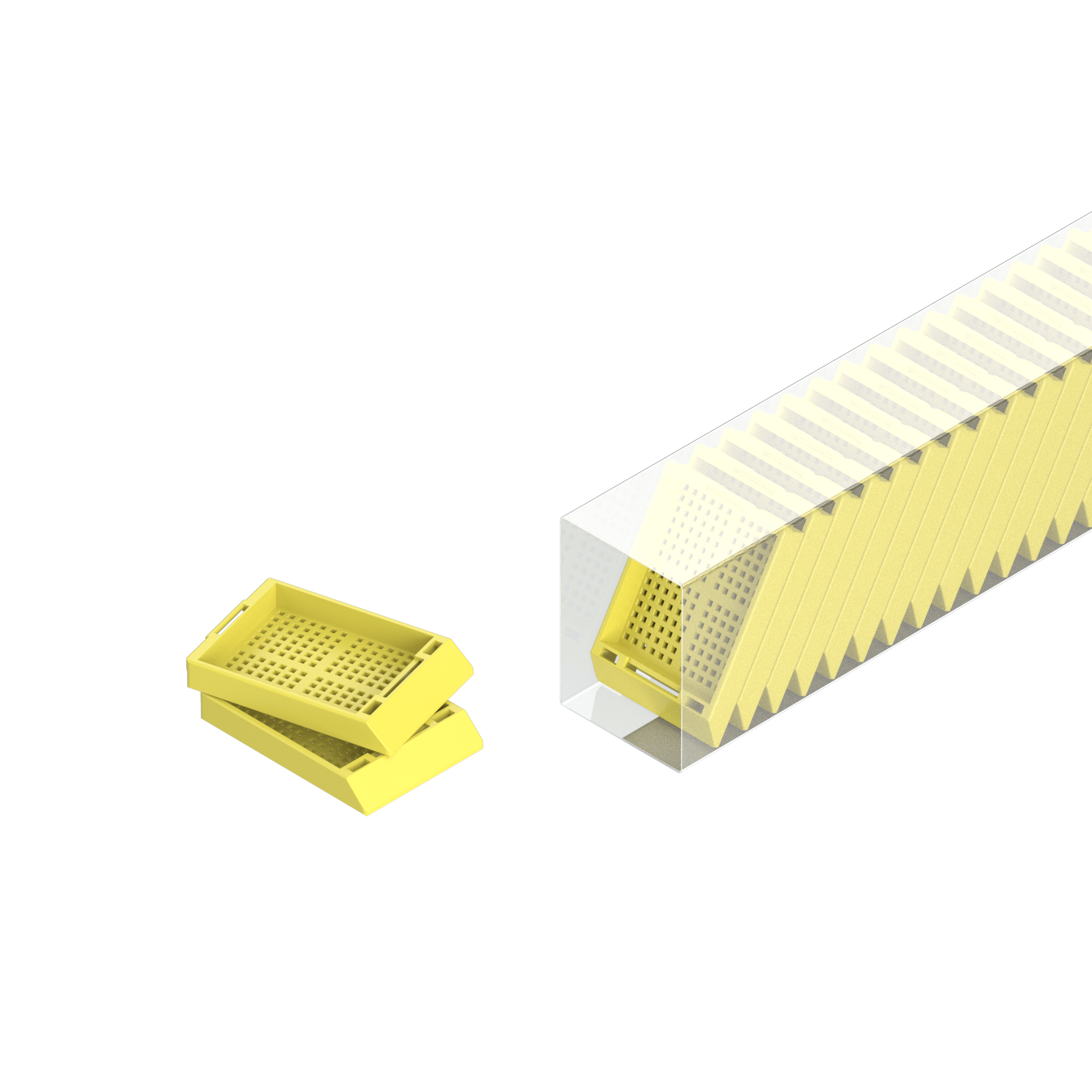 Die Einbettkassetten sind für die Verwendung mit Kassettendruckern gebrauchsfertig im Magazin vorgestapelt. Ein Magazin enthält 75 Einbettkassetten ohne Deckel.