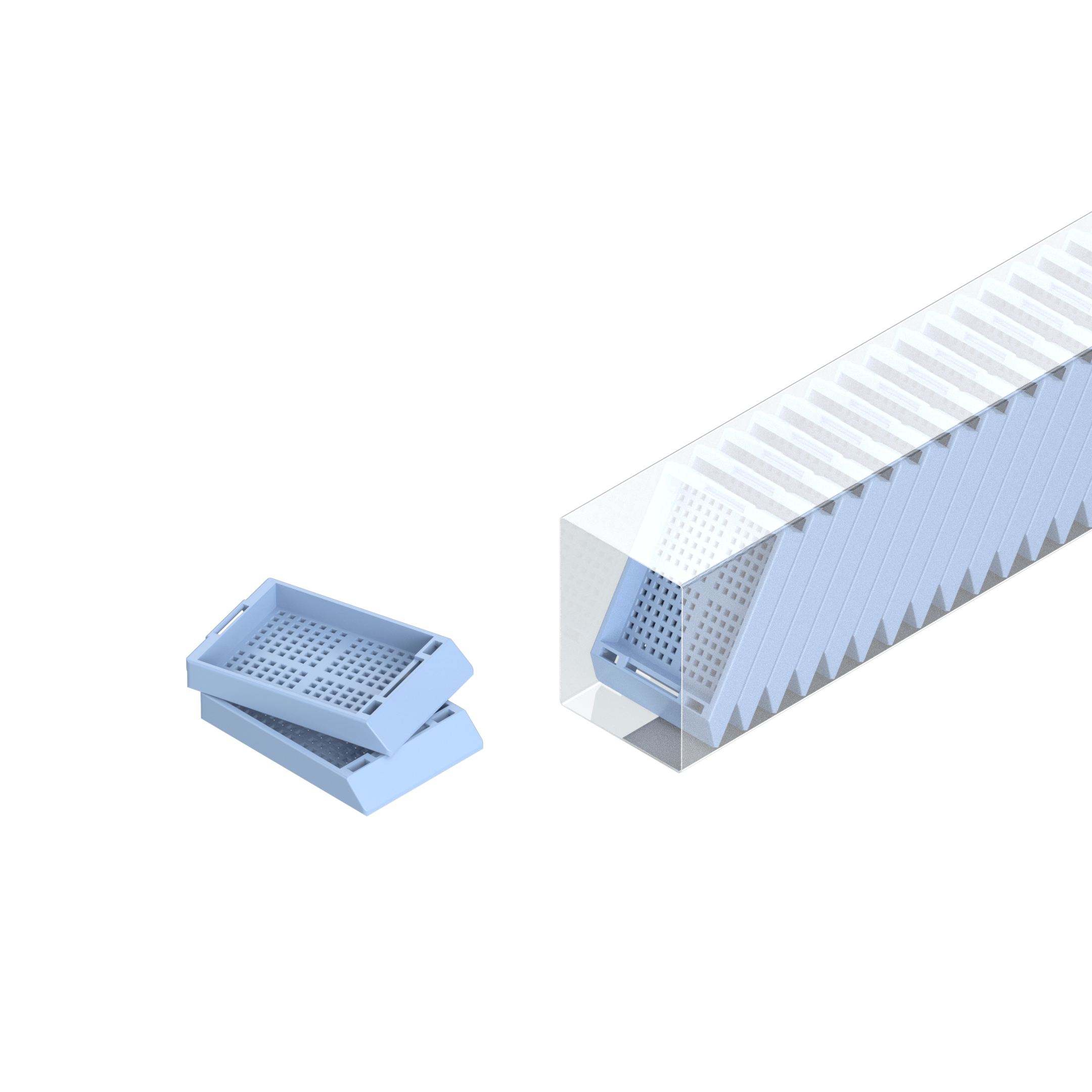 Die Einbettkassetten sind für die Verwendung mit Kassettendruckern gebrauchsfertig im Magazin vorgestapelt. Ein Magazin enthält 75 Einbettkassetten ohne Deckel.